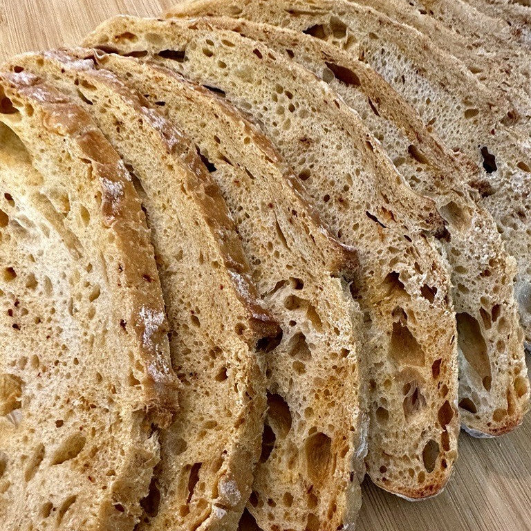 The loaf with a kick! Infused with spicy chili oil and crispy fried garlic & herbs, this loaf boasts a crunchy crust with just the right amount of heat. Perfect for those who love a little spice in their slice!