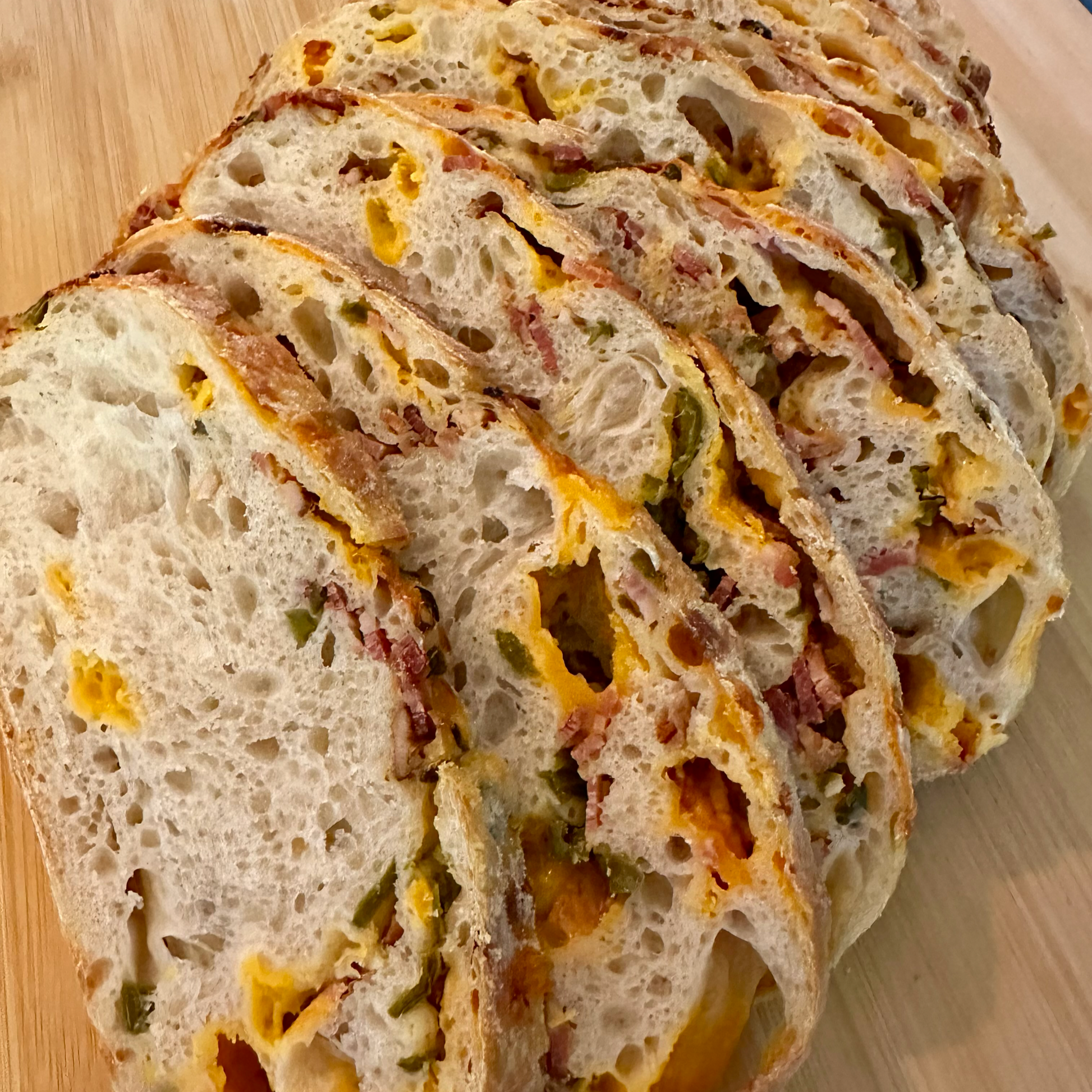 Savory sourdough features a crispy crust and soft interior filled with sharp cheddar, crunchy bacon, and jalapeños, offering a balanced flavor of heat, smokiness, and sharpness that lingers after each bite.
